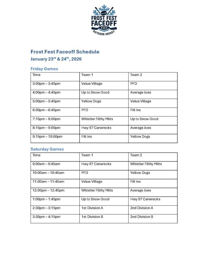 New for 2026 is the Frost Fest Faceoff, a 3 on 3 tournament located on the outdoor rink at Gyro Park. Eight teams will face off against each other on Friday and Saturday, with one team being crowned the winner.